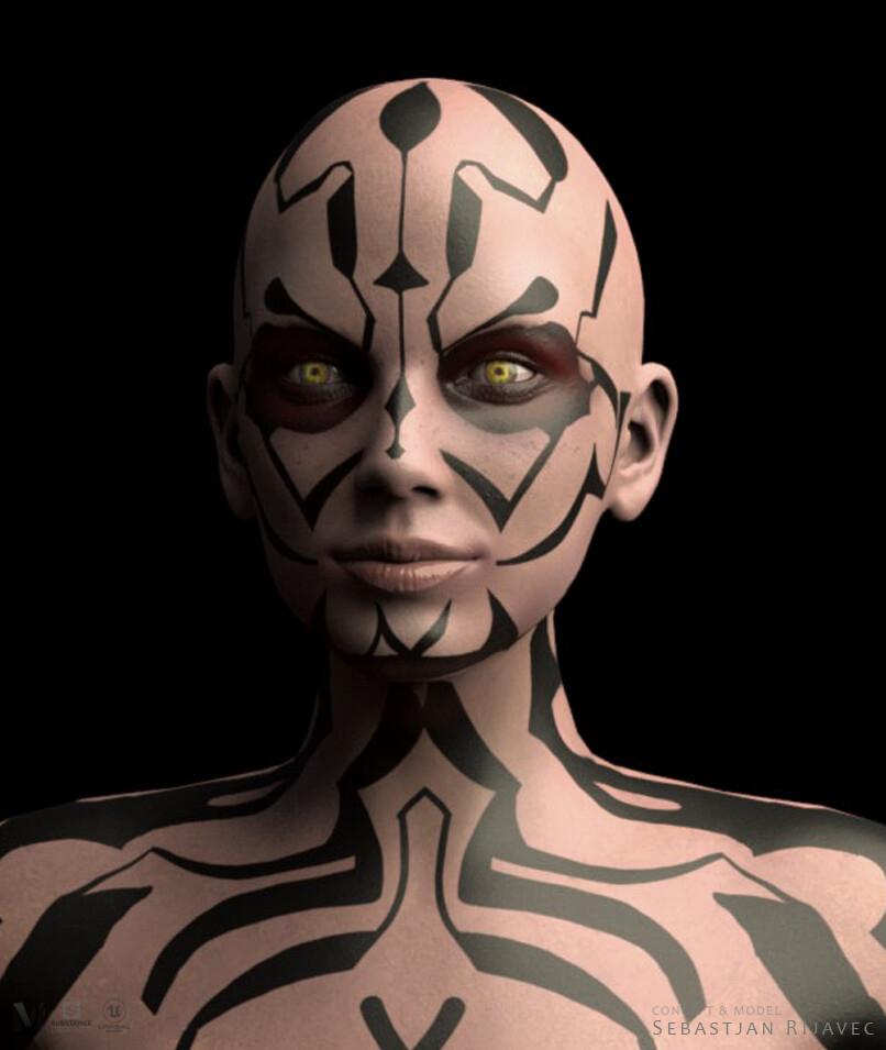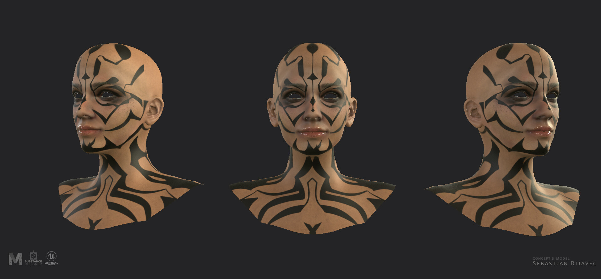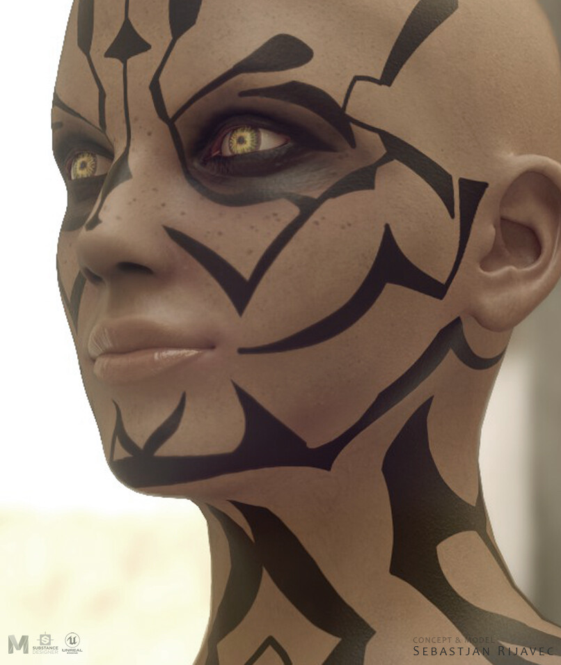 Facial tattoos. I replicated the tattoo designs in ZBrush as a general guideline, yet with some variations to enhance the facial structure of a female character, by either injecting or subtracting shapes. Most of the work went into making the shapes thinner.