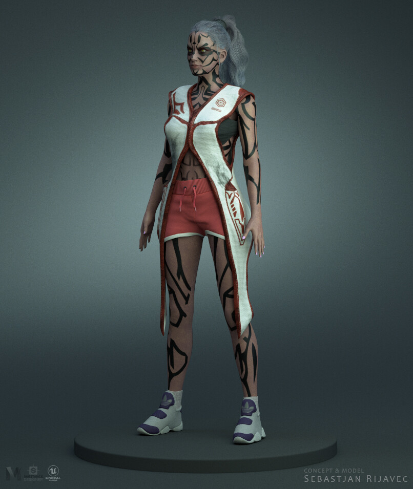 Facial tattoos. I replicated the tattoo designs in ZBrush as a general guideline, yet with some variations to enhance the facial structure of a female character, by either injecting or subtracting shapes. Most of the work went into making the shapes thinner.